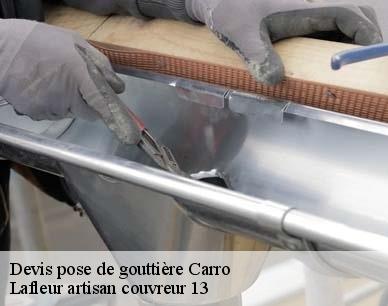 Lafleur artisan couvreur 13 se tient à vos côtés pour la définition de vos besoins en travaux de gouttière, vos différents objectifs et votre capacité financière. Nos professionnels sont à votre service pour tous travaux de pose de gouttière à Carro et dans toute la région. Nous pouvons prendre en main la pose de votre gouttière, son changement ainsi que sa remise en état qu’elle soit en zinc, en alu, en PVC... Particulier ou une grande entreprise ? N’hésitez pas à faire appel à nos services si vous résidez à Carro ou ses environs. Nous saurons vous offrir une gouttière impeccable, fonctionnelle et en parfaite harmonie avec l’aspect esthétique de votre bâti.